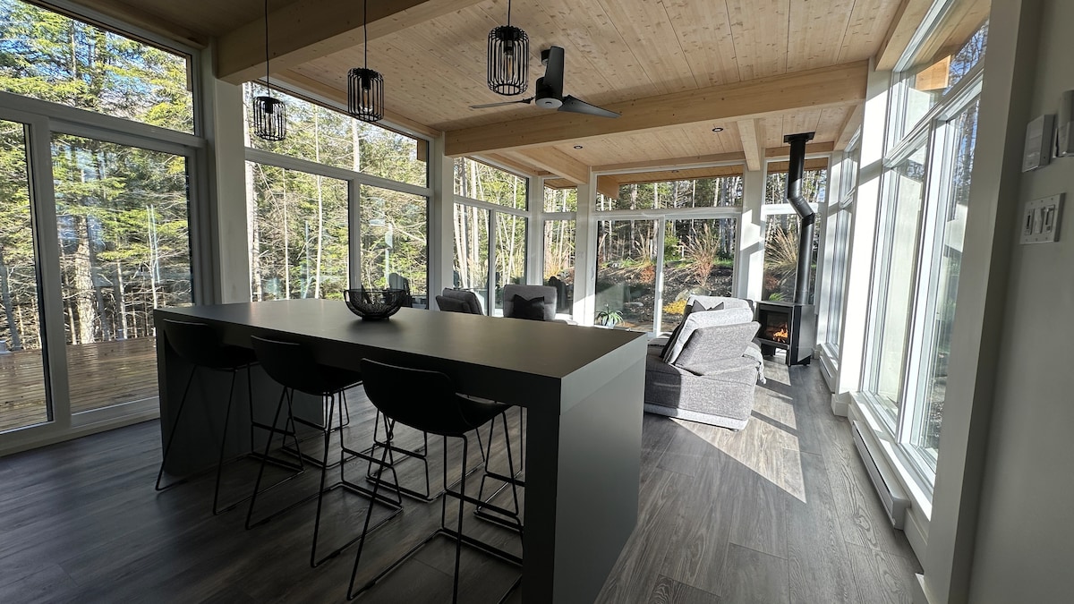 Welcome to La Khabine! This cozy, modern cabin comes with all you need to relax and connect with nature. Enjoy a glass of wine with the sound of a crackling fire in the wood burning fireplace. Take in the view of the forest through the surrounding floor to ceiling windows. Relax in the private outdoor cedar barrel sauna. Natural self-care products, firewood, laundry soap, and high-speed Wi-Fi are all complimentary. We hope you'll love our little cabin of windows as much as we do :)