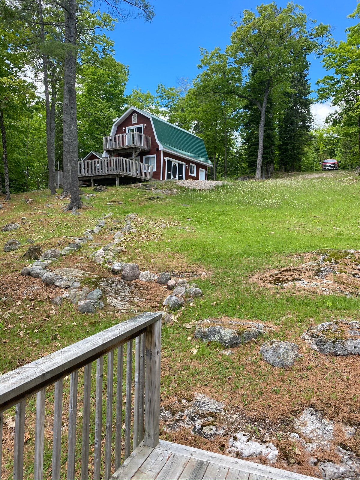 Cozy cottage on the hill overlooking the lake with a living space that offers a unique vibe with it's cathedral ceiling, fireplace, and floor to ceiling windows. Newly renovated bathroom. The two bedrooms accommodate 4 guests comfortably. We have high-speed wireless internet, satellite and Roku TV. All essentials supplied. Hiking, bicycle, ATV and sled trails along with ski hills are all within short driving distance. Your dog is welcome here! Winter tires needed on snowy days.