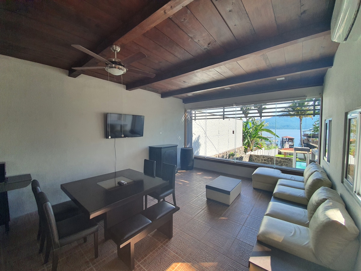 CASA FAMILIAR MODERNA, CON VISTA ESPECTACULAR, FRENTE AL LAGO, CON SU PISCINA Y MUELLE PRIVADO. FULL EQUIPADA. NO SE PERMITE MUSICA ALTO VOLUMEN, SILENCIO DE LAS 10:PM A LAS 9:AM. WIFI STARLINK. SI DESEA UNA CASA MAS GRANDE HASTA UN MAXIMO DE 25 CAMAS O NO HUBIERA DISPONIBILIDAD QUE USTED DESEA, PUEDE VISITAR EN AIRBNB LA CASA VISTALGO, LA CUAL ESTA A 50 METROS DE BLUEHOUSE. TARIFA ACORDE A # DE HUESPEDES, NO A # DE CAMAS.