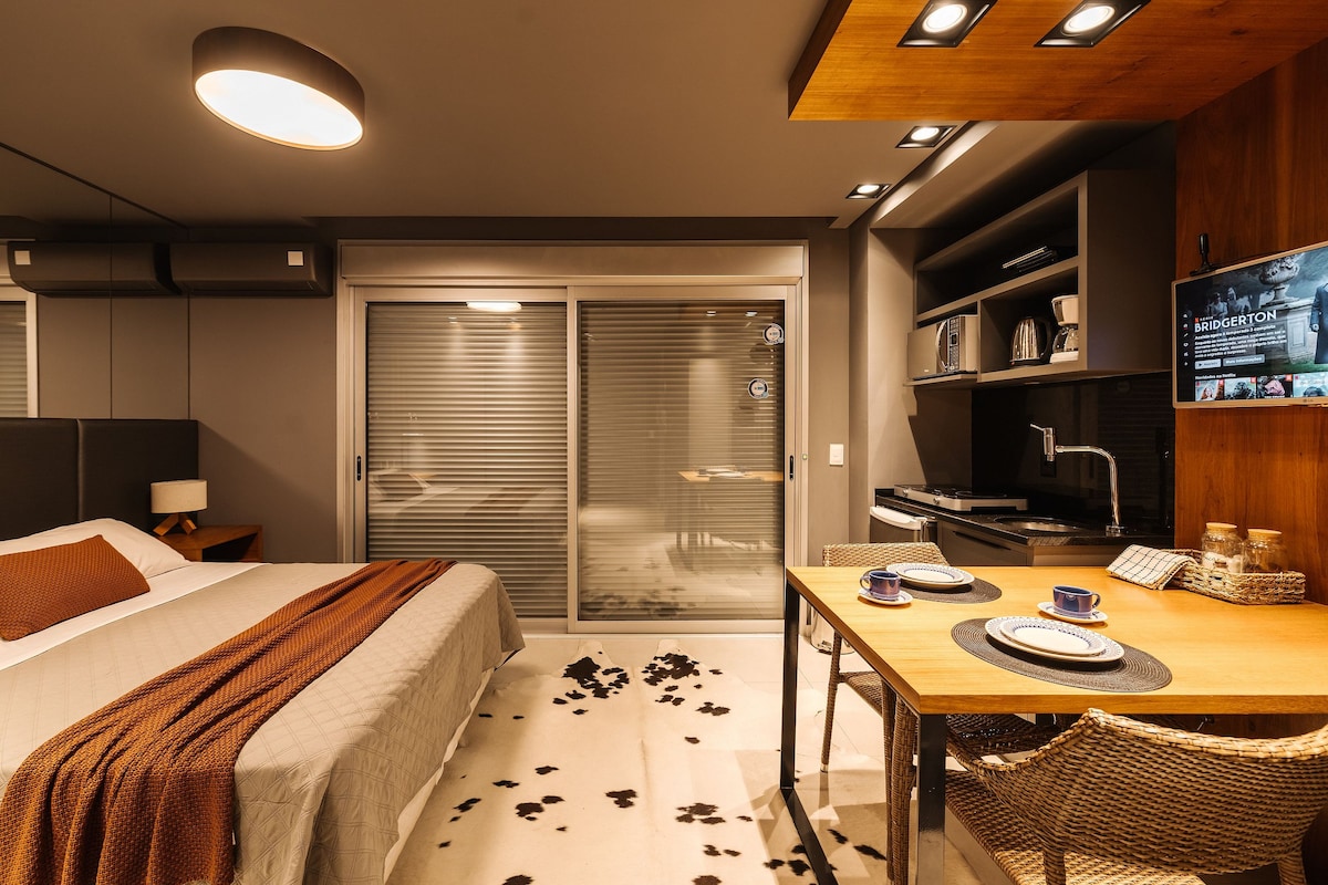 Aproveite uma estadia confortável neste studio elegante, moderno e integrado. O espaço oferece cama confortável, ar-condicionado, Wi-Fi, TV e cozinha completa com geladeira, fogão, forno, micro-ondas e utensílios. Destaque para a área externa privativa, ideal para relaxar, além de estacionamento privativo para mais comodidade. Localizado em prédio moderno e seguro, é perfeito para casais, trabalho ou estadias longas.