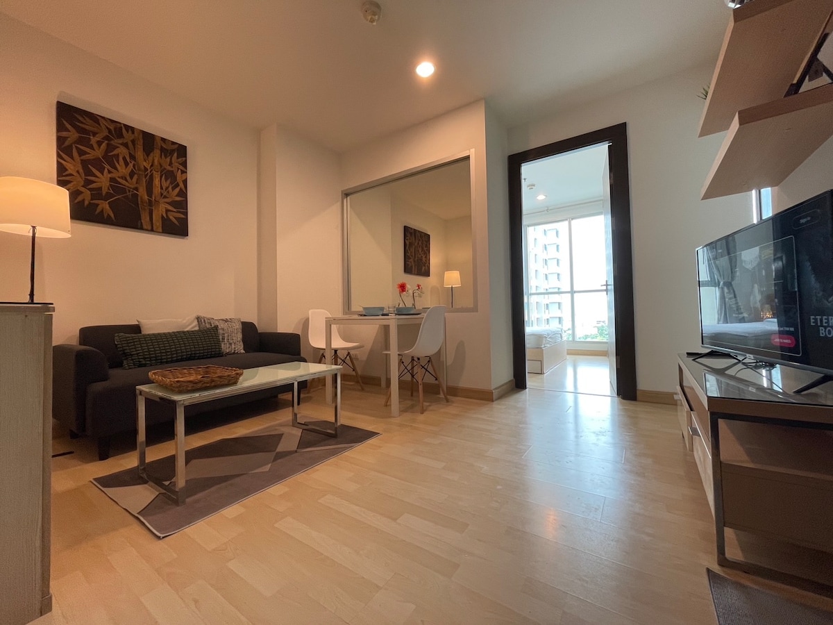 Sawadee Kha! Thank you for visiting my room listing. A modern luxury 1 Bedroom closed to MRT subway and superb facilities [WiFi/Pool/Fitness/Garden/Rooftop]. 10 m walking to MRT Ratchadaphisek station 15 mins or 3 stops by MRT to Chatuchak Park 20 mins or 4 stops by MRT to Central Rama9 45 mins or 10 stops by MRT & Airport Rail Link to Suvarnabhumi Airport Also, we provide airport pick up service for VIP guests like you as a complimentary. We are waiting for you to be our guest :)