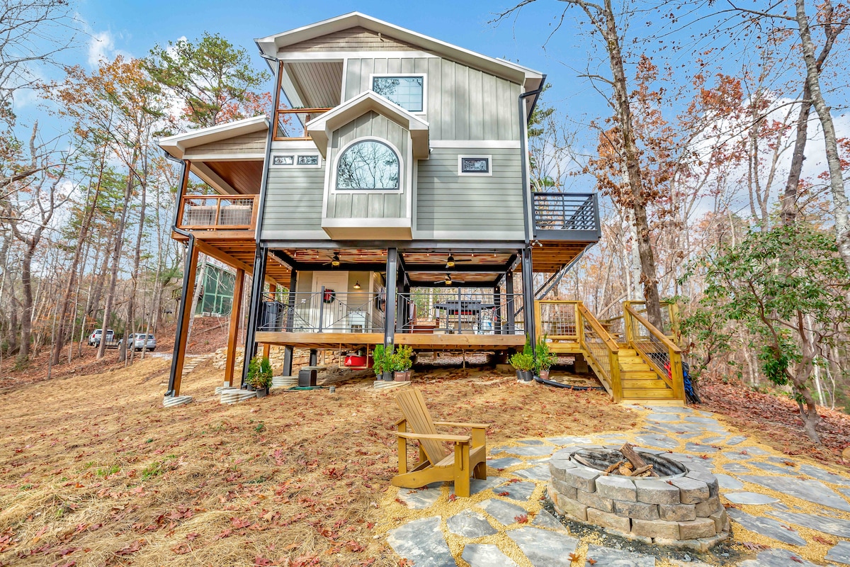 Meadowstream Lodge offers a one-of-a-kind experience. Set on 2.5+ acres w/rare large pasture, -great for pets and kids- creek, forest and views of Black Rock Mountain. Feels like an estate, yet walkable to downtown Clayton’s fantastic dining, shops, and bars. Unwind in the hot tub/pool (heated) combo for 10, gather around the fire pit, or lounge on the large deck with café lights and fire bowl. Every detail-from designer interiors to curated family amenities- makes for an unforgettable stay.