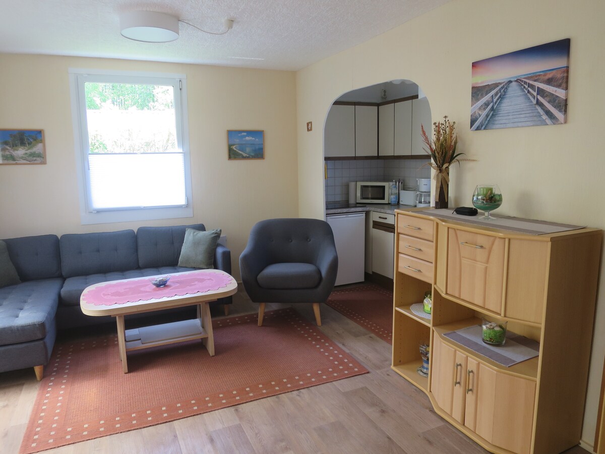 Stralsund yaxınlığında, şəhər sərhədindən 5 km məsafədə tətil mənzili icarəyə verilir. Şəhər mərkəzi təxminən 10 km məsafədədir. Avtomobillə 15 dəqiqəyə Ryuqen adasına çata bilərsiniz. Dənizkənarı kurortlara təxminən 40 dəqiqə ərzində çatmaq olar. Qatarla gəlmək də mümkündür (qatar stansiyasına piyada təxminən 5 dəqiqəlik məsafə). Ən yaxın ərzaq mağazası 2,5 km məsafədədir. Qonaqlar 2016-cı ildə təmir edilmiş iki otaqda rahatlıqla qala bilərlər. Əlavə çarpayı imkanı verilir.