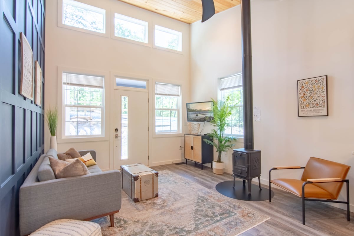 Hot-tub və çatlayan od çuxuru olan lüks təpəlik istirahət yeri. 3 Kral ölçülü çarpayı, 1 Kraliça ölçülü çarpayı, 1 Kraliça ölçülü futon, Aşpazın mətbəxi, 10 nəfərlik yataq yeri. Ailələr uşaqların araşdırması üçün hovuz masasını, stolüstü oyunları və arxa həyəti sevir. Uşaqlar üçün uşaq stulu və portativ uşaq çarpayısı hazırdır! Yürüyüşdən və yerli yeməkdən bir neçə dəqiqə sonra gün batımı üçün evə qayıdın. Tarixlərinizi qorumaq üçün indi bron edin. Çimni Rok və Çimni Rok Dövlət Parkı AÇIQDIR! Göl 2026-cı ilin may ayında yenidən açılacaq!
