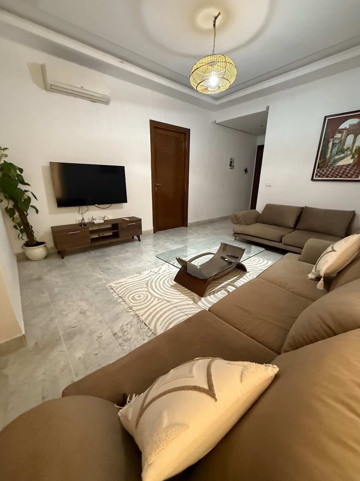 Appartement moderne avec salon lumineux et chambre confortable, décoré avec goût et entièrement équipé pour votre confort. Profitez d’une piscine élégante et privative dans un jardin agréable pour des moments de détente inoubliables. Situé à Ain Zaghouan Nord dans une zone résidentielle de haute qualité , à proximité des Berges du Lac et de La Marsa et à 10mn de 🛫 Il offre un emplacement idéal entre calme, loisirs et attractivité. L’endroit parfait pour allier repos, style et convivialité
