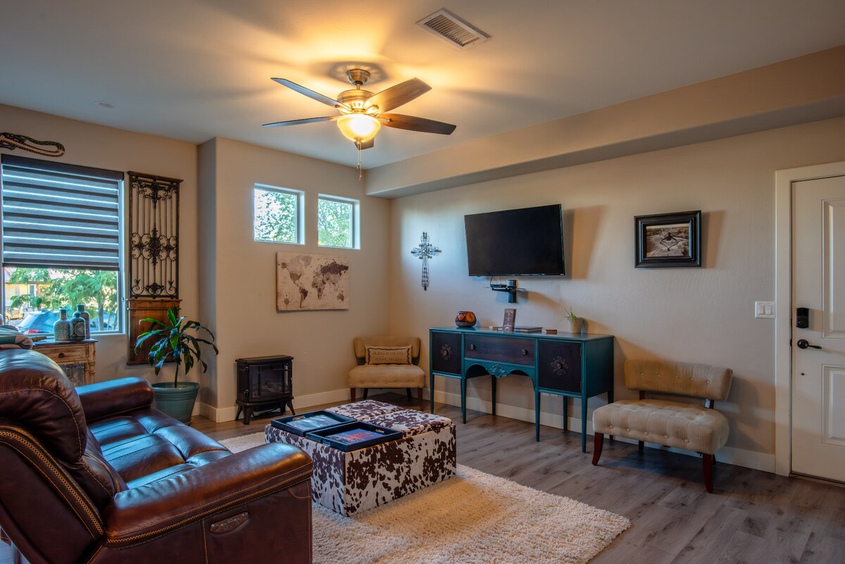 Səhra vahəmizə xoş gəlmisiniz: EV HEYVANLARI İLƏ DOSTLUQ edən gözəl bir bağ səviyyəsində mənzil! Yürüyüş/qayıq sürdükdən sonra arxa həyətdəki yanğın çuxuru və barbekü ətrafında dincəlin. Bu, Rim cığırına, mənzərəli və ya it parkına qısa bir gəzintidir. Qayıq/avtomobil parkinqi. Qrand Dairə ərazisinin təklif etdiyi bütün imkanlardan zövq alın --3 Natl Parklar, Pauel gölü, Atlı Bend, slot kanyonları və daha çoxu! (Qapalı məkanda yavru yastıqlarına icazə verilmir. Həyət tam hasarlanıb. Bron etməzdən əvvəl 2-dən çox ev heyvanınızın olub-olmadığını soruşun.)