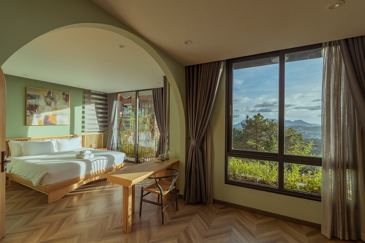 Bu, təbiətin əhatə etdiyi rahat istirahət məkanı – ən çox sevdiyimiz taxta evlərimizdən biridir. Kabinədə bütöv bağçaya baxan heyrətamiz mənzərəsi olan geniş 2 metr geniş çarpayı var. Qonaqlar rahat mühitdən zövq ala və Dalatın orijinal cazibəsini yaşaya bilər — sakit səhərlər, təmiz hava və pəncərənizin çölündə tam çiçək açan bağ.