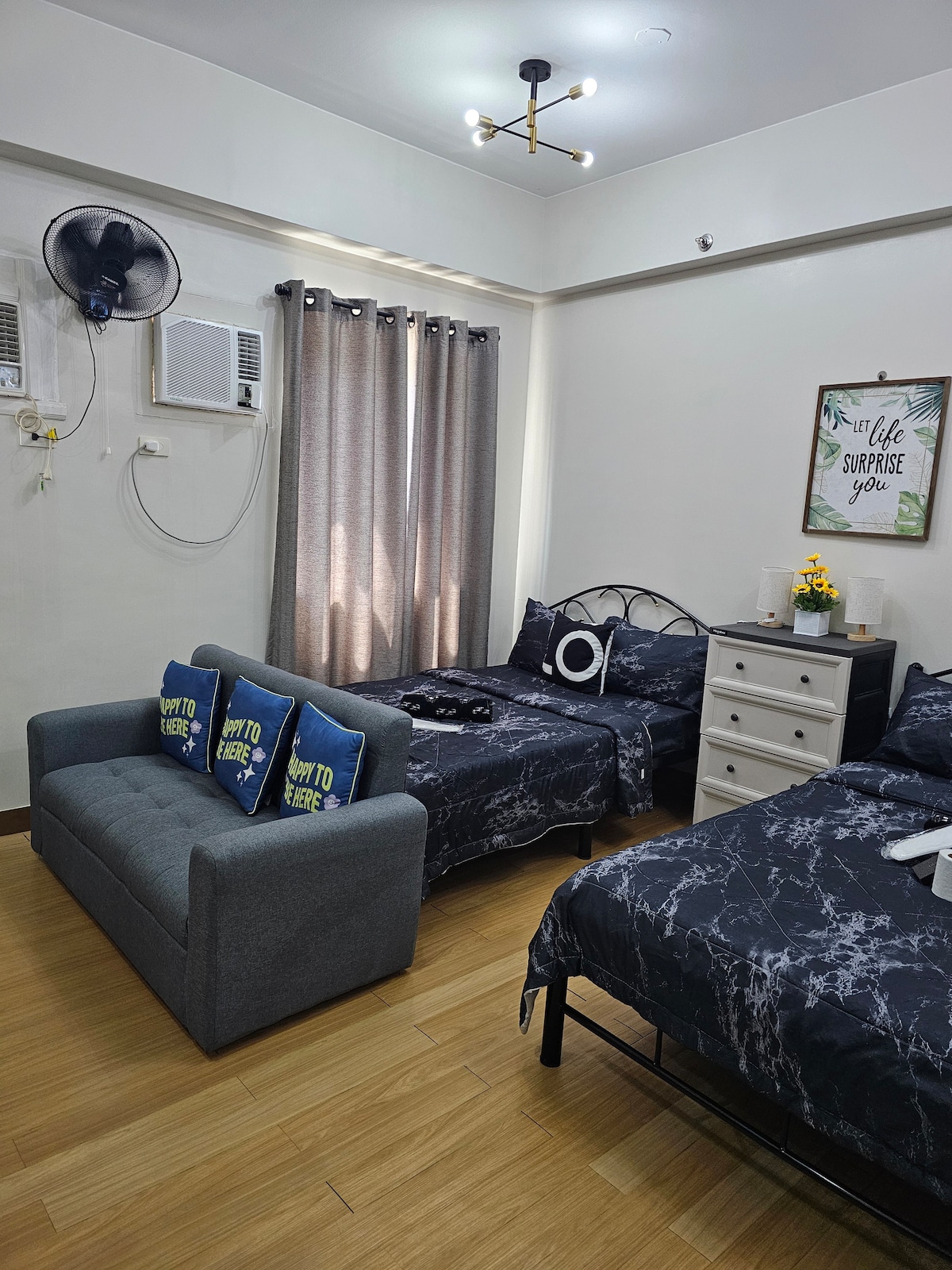 David’s Suite is Minimalist Scandinavian fully furnished Spacious Unit. Enjoy the pool and the convenience of having SM City Mall just across the condo . No direct sunlight all day . The unit is complete with kitchen utensils to cater your staycation or long term stay . Enjoy WIFI connection , Netflix and You tube access in our 55" smart TV . Board games and are also provided for family and friends bonding time . At david's suite you'll find a cozy and inviting space designed for relaxation