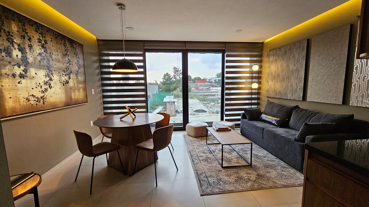 Relájate en esta escapada única! disfruta de este cálido y excepcional espacio, diseñado para que disfrutes tu estadía en la cuidad, con estilo y la comodidad de tener todos los servicios cerca; como hospitales, escuelas, centros comerciales, trota pista, restaurantes y espacios recreativos dentro de las instalaciones como alberca, roof garden y gimnasio, así como estacionamiento cubierto y elevador que harán de tu estancia, toda una experiencia placentera sea cual sea el motivo de tu visita.