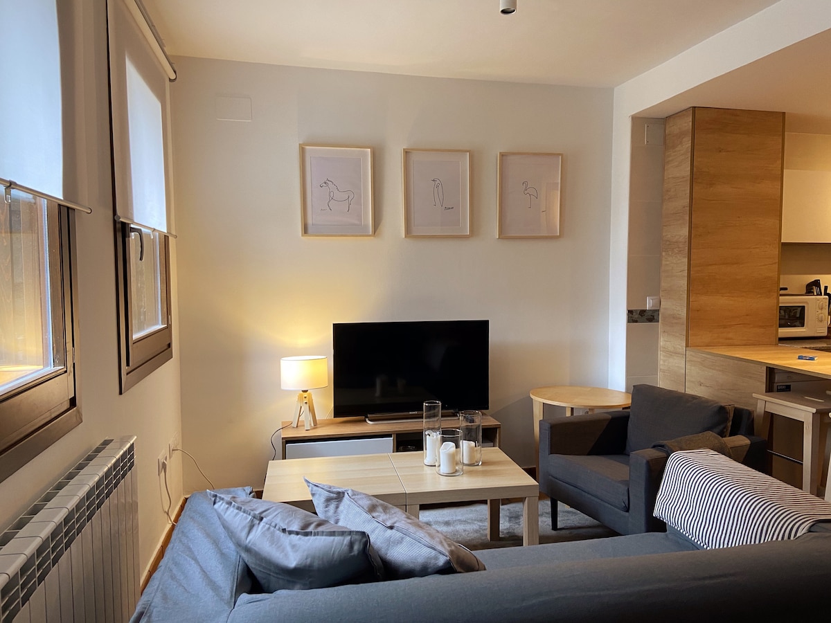 Cálido apartamento de una habitación totalmente equipado para estancias cortas o largas, ubicación privilegiada para disfrutar de las principales atracciones que ofrece el Pirineo aragonés. Queremos que te sientas como en casa, por ello tendrás a tu disposición: - Cocina totalmente equipada. - Baño con bañera y agua caliente. - Trastero disponible para guardar de forma segura material deportivo. - Te podemos orientar: rutas bici, trekking, cata, ocio, etc.