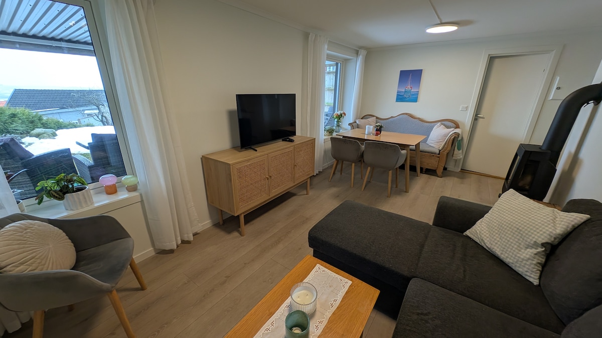 Modern and attractive house with 3 bedrooms. The house is located quietly, in the middle of a cul-de-sac with a fantastic view over the Larviksfjord, where sea and sky meet. This is recreation for the soul and a good place to be. Live with the sea right in front of you and the beautiful Bøkeskogen right behind. You have everything within reach; Bølgen cultural centre, Indre Havn, beach, Spa, town, restaurants, hiking, coastal path, training, transport. Everything within a 5-10 minute walk.
