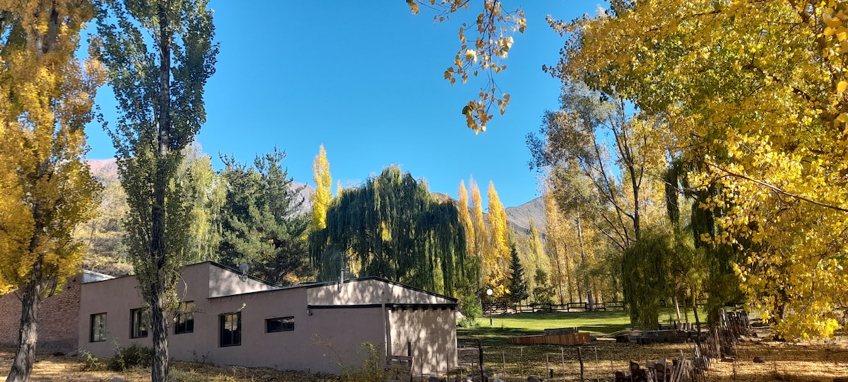 Müasir memarlıq kotteci. Üç yataq otağı. İki tam vanna otağı Qonaq otağı, yemək otağı və mətbəx. Meşədə ikinci qonaq otağı. Qapalı buxarı. Elektrik və kerosen isitmə sistemi. Qalereya və bağ. Kordilyer de Los Andes mənzərəli yuxarı göyərtə. Bağda od çuxuru və palçıq sobası. WiFi. Tamamilə vadinin sakitliyinə qərq olub (yaxınlıqda qonşu yoxdur). 10 dəq. şəhər mərkəzi kəndi Mendoza şəhərindən və Beynəlxalq Hava Limanından 1,5h.