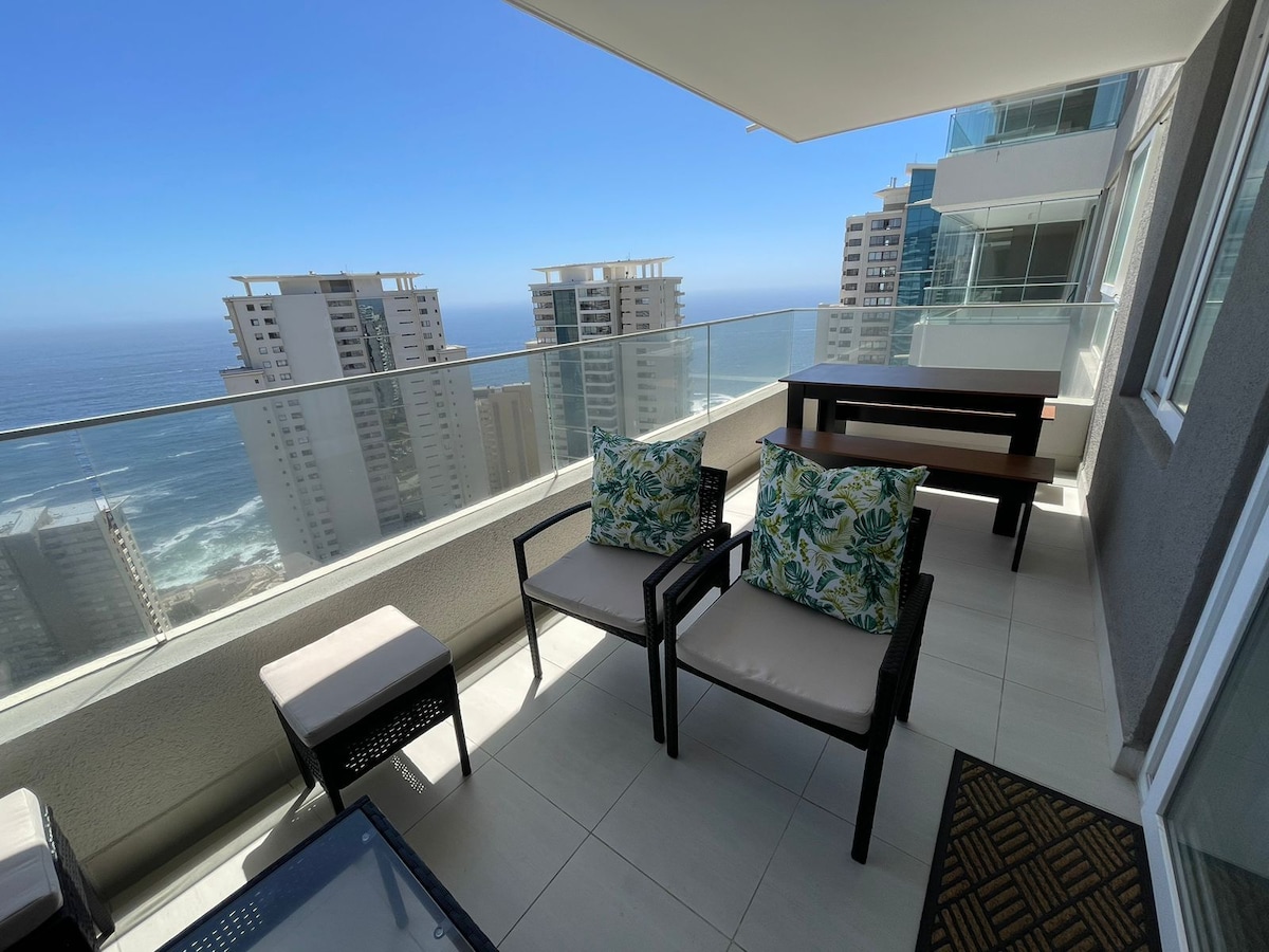 Lindo departamento con terraza vista al mar, un dormitorio un baño, completamente amoblado y equipado. Cuenta con wifi y cable para la tv smart de 42 pulgadas. Excelente iluminación. Edificio cuenta con consejería 24 hrs, 2 piscinas: exterior y temperada, gimnasio, sauna, quincho, lavandería y estacionamiento. Se encuentra cerca de supermercados, bencineras, farmacias. Ubicado a 5 minutos de la playa en auto, y 20 minutos a pie. Se ofrece descuento del 10% a estadías mayores a 7 días.