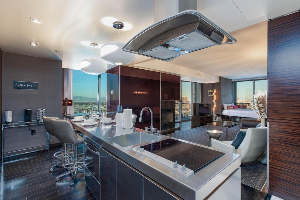 Perched high above the city in a modern high-rise, this exquisite corner penthouse offers unparalleled views of both the lush, rolling greens of the golf course and the dazzling lights of the Las Vegas Strip. Floor-to-ceiling windows flood the space with natural light by day and showcase the vibrant cityscape by night.