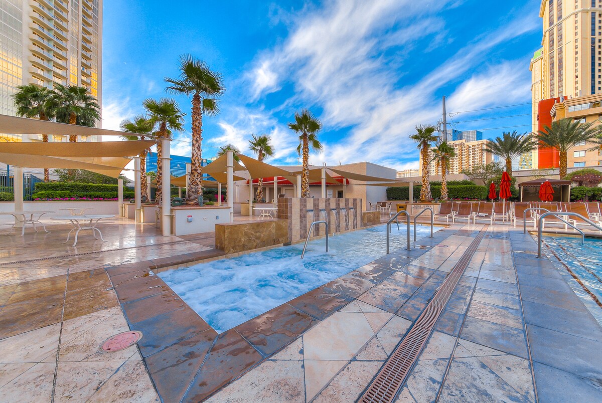 Experience unparalleled luxury at our distinguished 1-bedroom suite located within Palms Place, Las Vegas! Partake in the offerings of exclusive facilities such as a pristine pool, cutting-edge gym, and an array of premium hotel services. Retreat to your private oasis adorned with a sumptuous marble bathroom featuring a rejuvenating Jet-Tub. Savor panoramic views from your expansive balcony and unwind, knowing that we've meticulously crafted every aspect for a comfortable stay.