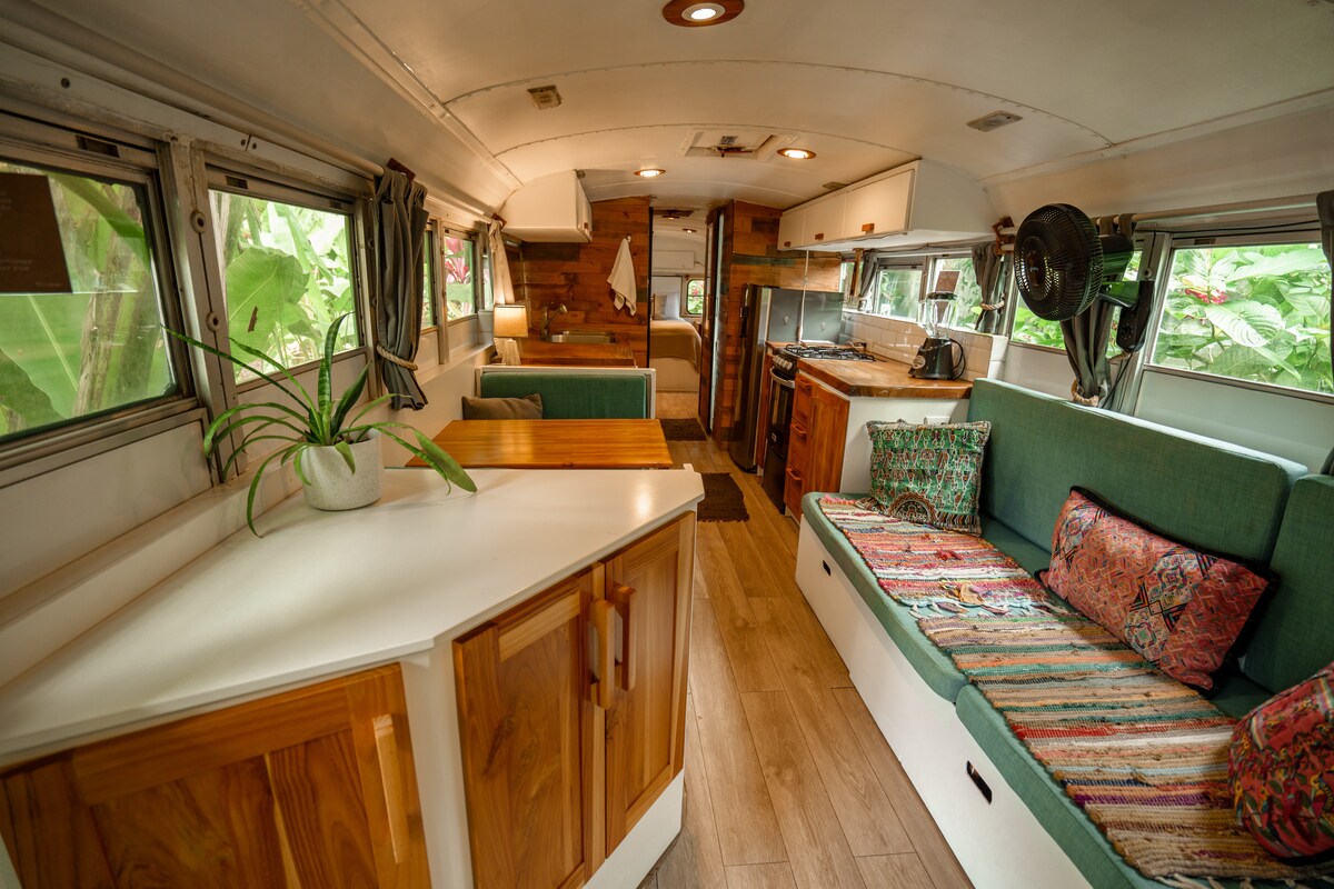 Bu 1970 Bluebird Schoolbus rahat və şıltaq bir yaşayış məkanına çevrilmişdir. Arxa hamam otağı, qonaq otağı və bir böyük və ya iki uşaq üçün yataq loftu ilə yeni bir əlavə ilə birləşir. Təpə ölkəsində bir hasarlanmış ərazidə yerləşir və öz şəxsi avtomobil yolu var. Verandada gözəl rahat stullar və propan və ya kömür manqal seçiminiz var. Avtobusda yeni kraliça çarpayısı və yeni qaz diapazonu olan qalley mətbəxi və qranit səhər yeməyi barı, qəhvə və çay var. İndi w Wi-Fi