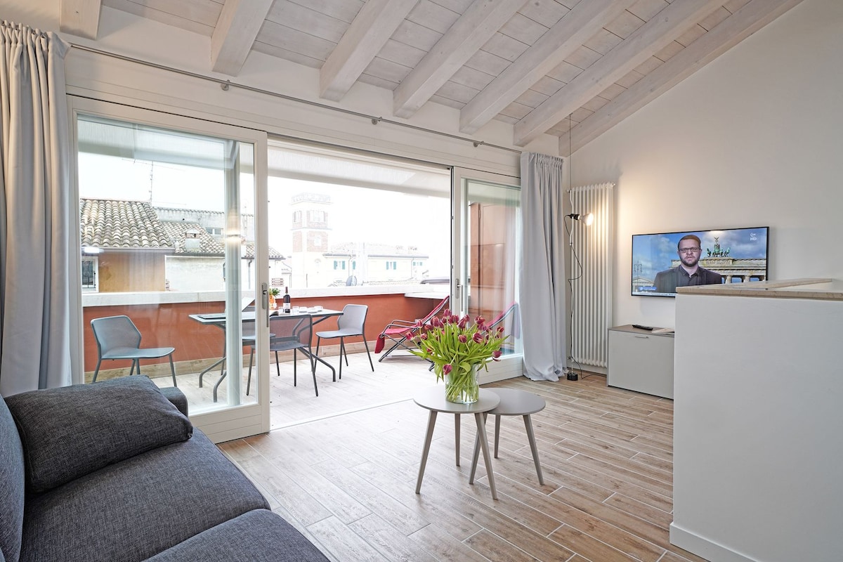 All'interno di Casa Carlottina, un moderno attico dal sapore romantico. Lo divide dalla passeggiata del lungo lago e delle caratteristiche viuzze gardesane solo l'antica scala d'accesso alla residenza. Previa disponibilità, possibilità di prenotazione di due appartamenti comunicanti, fino a 11 posti letto. Strategica posizione per visitare il Lago di Garda e le sue attrazioni come Gardaland, Caneva e Movieland. Possibilità di parcheggio a pagamento.