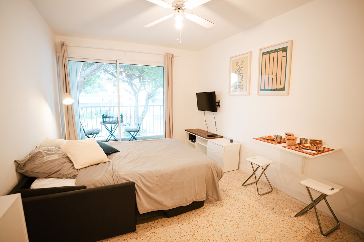 Bu sakit və zərif qonaqlama yerində ☀️dincəlin. ☀️Dənizlərin mərkəzində gözəl dəniz mənzərəli, 3-cü mərtəbə (lift yoxdur) olduqca 20m2 studiya və terras var. 2 böyük və ya 1 böyük və 1 uşaq üçün ☀️Gözəl terras, kondisioner, tam təchiz olunmuş mətbəx, Nespresso, soyuducu, qabyuyan maşın, paltaryuyan maşın, elektrik sobası, mikrodalğalı sobaya açılan qonaq otağından ibarətdir... Çimərlik və mağazalardan ☀️8 dəqiqəlik məsafədə ☀️Ayrıca parkinq və pulsuz Wİ-Fİ 🏊♂️HOVUZ MAYIN 15-DƏN sentyabrın 30-dək AÇIQDIR