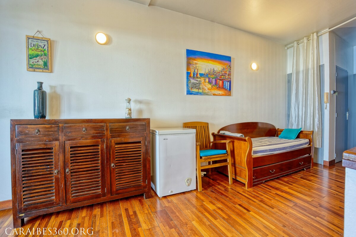 Suda ayaqlarınızla fasilə vermək üçün özünüzü mükafatlandırın! Çantalarınızı dəniz yolu ilə üzbəüz rahat studiyaya yerləşdirin. Romantik qonaqlama və ya günəşdə rahat tətil üçün mükəmməl ünvan, Martinikanın düz ortasında. Gün batımında günəşin doğması, qızılı aperitivlərlə üzbəüz terrasda ☀ səhər yeməyi... Burada yavaşlayırıq. Qənaət edirik. Dəniz barmaqlarınızın ucundadır və hava dayandırılmış kimi görünür.