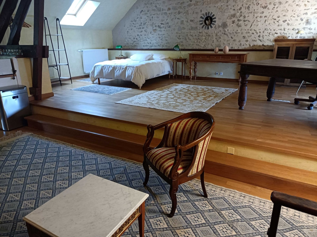 Loft à la campagne, pour un séjour calme et dépaysant. La pièce de vie (environ 60 m2) est à l'étage. La salle d'eau en rez-de-chaussée (wc et douche) comprend un jacuzzi. Accès direct par porte vitrée à la piscine couverte (et chauffée à 28 degrés). Le loft est dans une aile de la résidence principale. Pour plus d'espace, vous pouvez adjoindre une deuxième chambre (avec sa propre salle d'eau) : voir annonce LOFT plus
