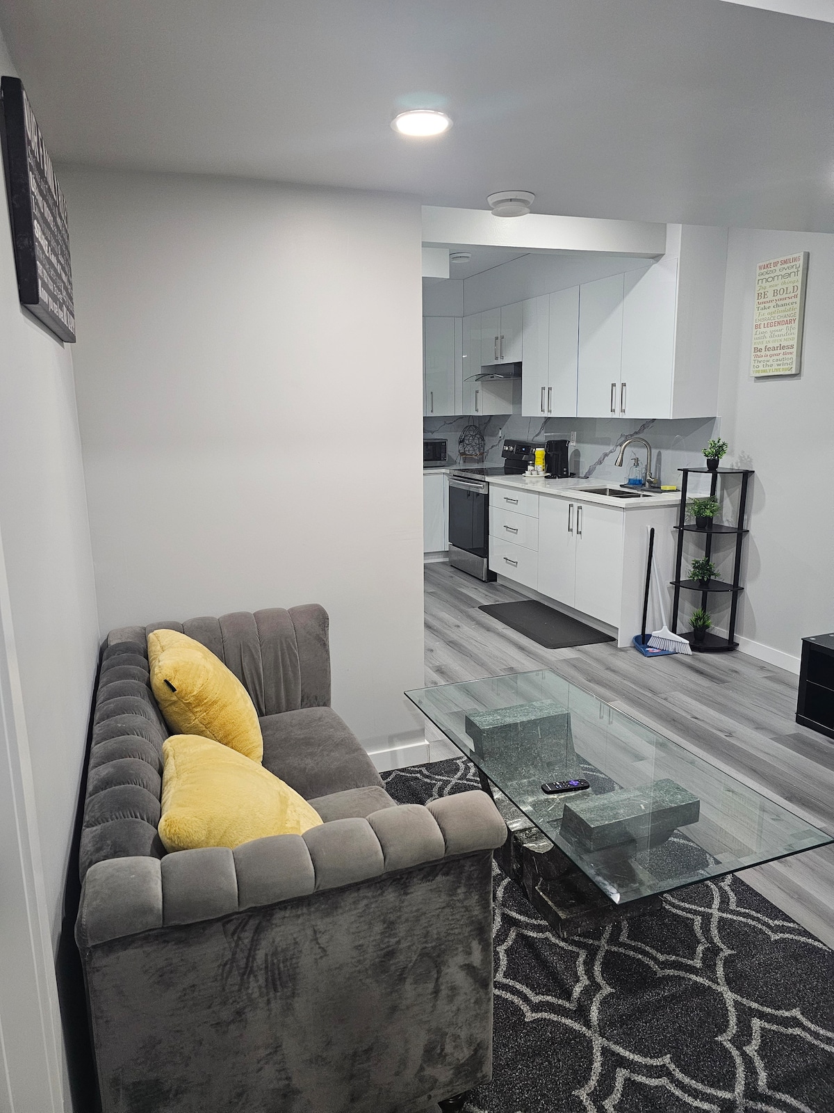 This unique place has a style of its own. With a 65 inch TV installed in the cozy living area which has a sofa bed. TV has Netflix for your entertainment, you’ll feel pampered. The large bedroom is furnished with super comfortable queen bed for your relaxation. The kitchen is well equipped with all you need to feel at home. You will come back for more of this luxury located in a quiet area and yet 300meters walk to supermarkets, dollar store, Tim hortons and restaurants. Close to the airport