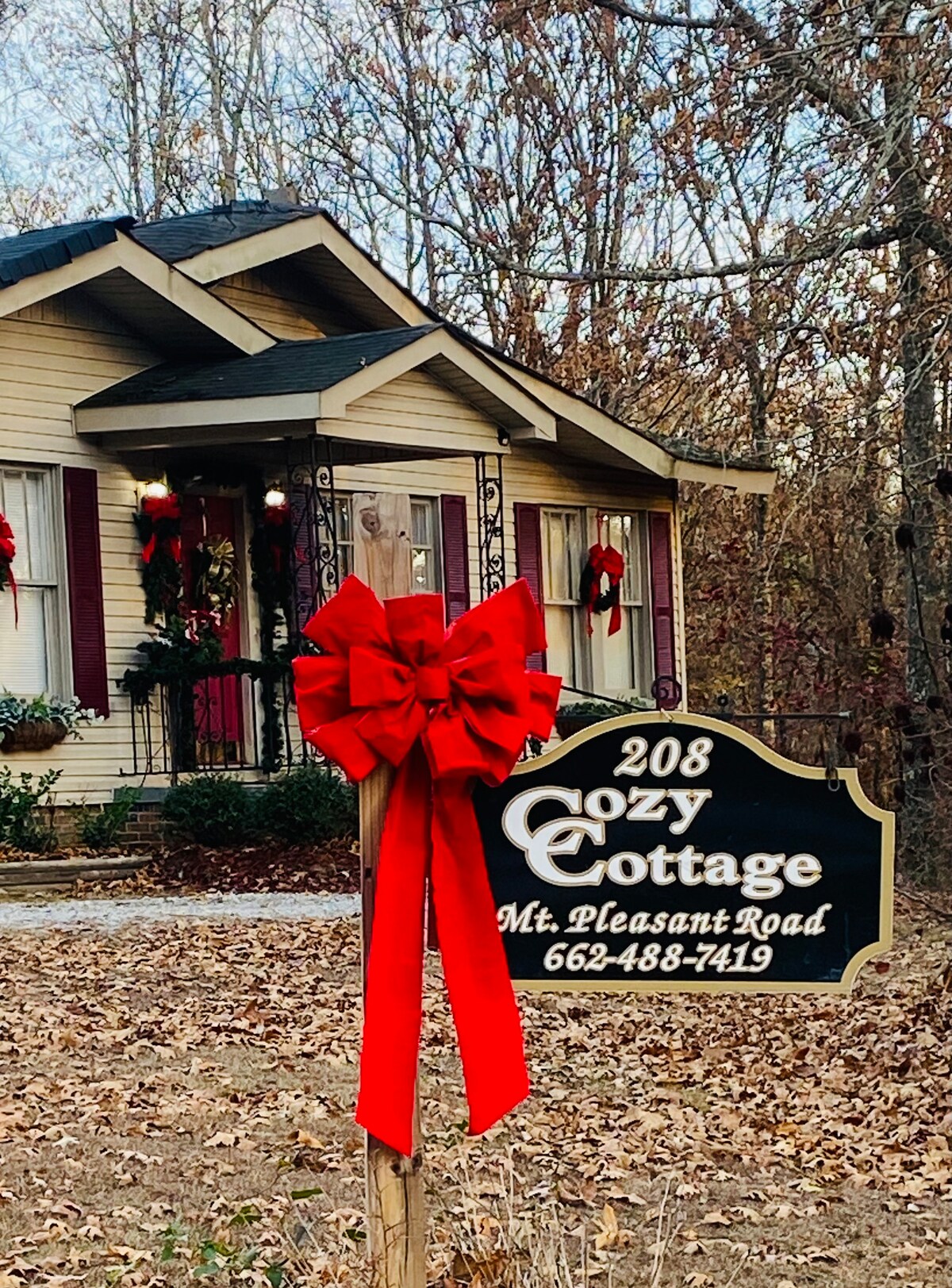 Take it easy at this unique and tranquil getaway. 7 minutes from the Tupelo Flea/Furniture Market! PET & FAMILY FRIENDLY!!! The cottage features a living area, a fully equipped kitchen, and a dining area. This older home does not have a lot of outlets, but I have cellphones charging stations in the living room and each bedrooms. Bedrooms are complete with a plush bedding and soft linens. outside is a private wrap around patio and on the back deck a private dining area with party lights above.