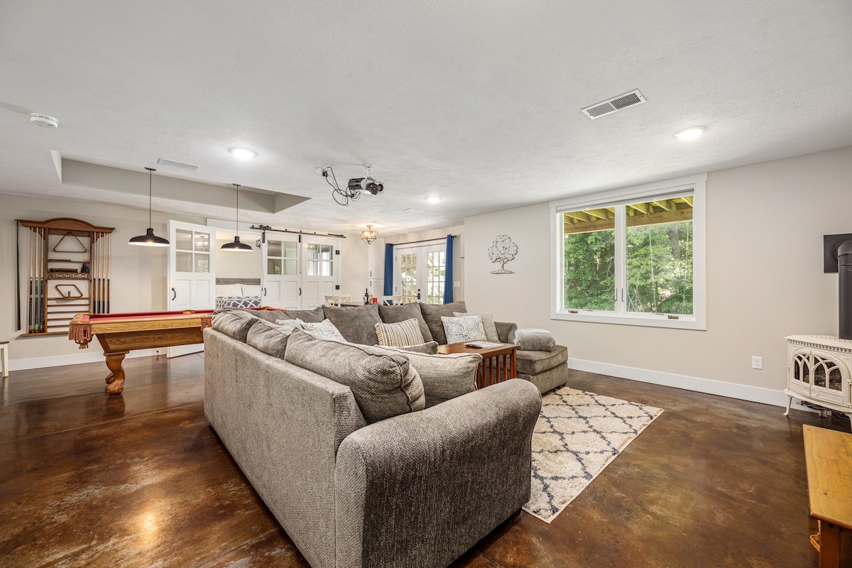 This light and bright newer lower level suite is almost 900 square feet with an open floor plan. Rooms include a living/dining/kitchenette area, private bedroom, and bathroom. All very crisp, clean, and modern. A separate parking area will lead you down steps to a private patio adorned with seating for a place to relax and enjoy the rolling hill backyard and woods. The suite is stocked with several amenities to make your stay comfortable, including a welcome bottle of local wine and goodies.
