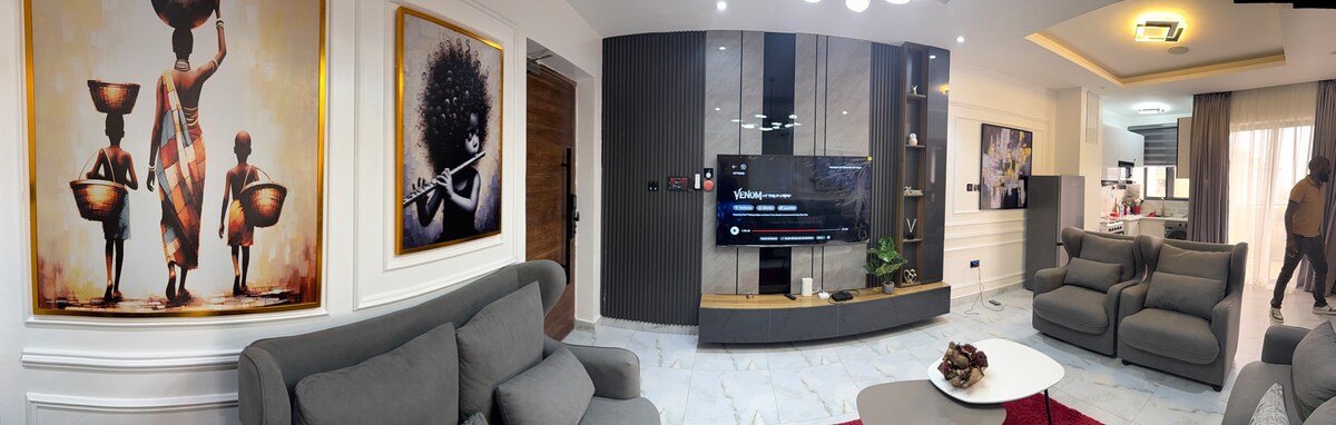 Freedom Way, Lekki Phase 1-in qarşısında, qapalı, təhlükəsiz əmlakda yerləşən bu müasir 2 yataq otaqlı mezonetdə rahatlığı təcrübədən keçirin. 24/7 elektrik enerjisi, kondisioner, Wi-Fi, təhlükəsiz parkinq və yeni sahilyolu mənzərəsindən zövq alın. Smart TV-lərlə geniş, hamam otağı olan yataq otaqları, rahat qonaq otağı, yemək sahəsi və tam təchiz olunmuş mətbəx var. Özəl balkon, PS5 və stolüstü oyunlarla dincəlin. Nike İncəsənət Qalereyasından, Landmark Beach-dən, Filmhouse Imax-dan və ən yaxşı Lekki restoranlarından cəmi bir neçə dəqiqəlik məsafədə - mükəmməl Lagos tətiliniz!