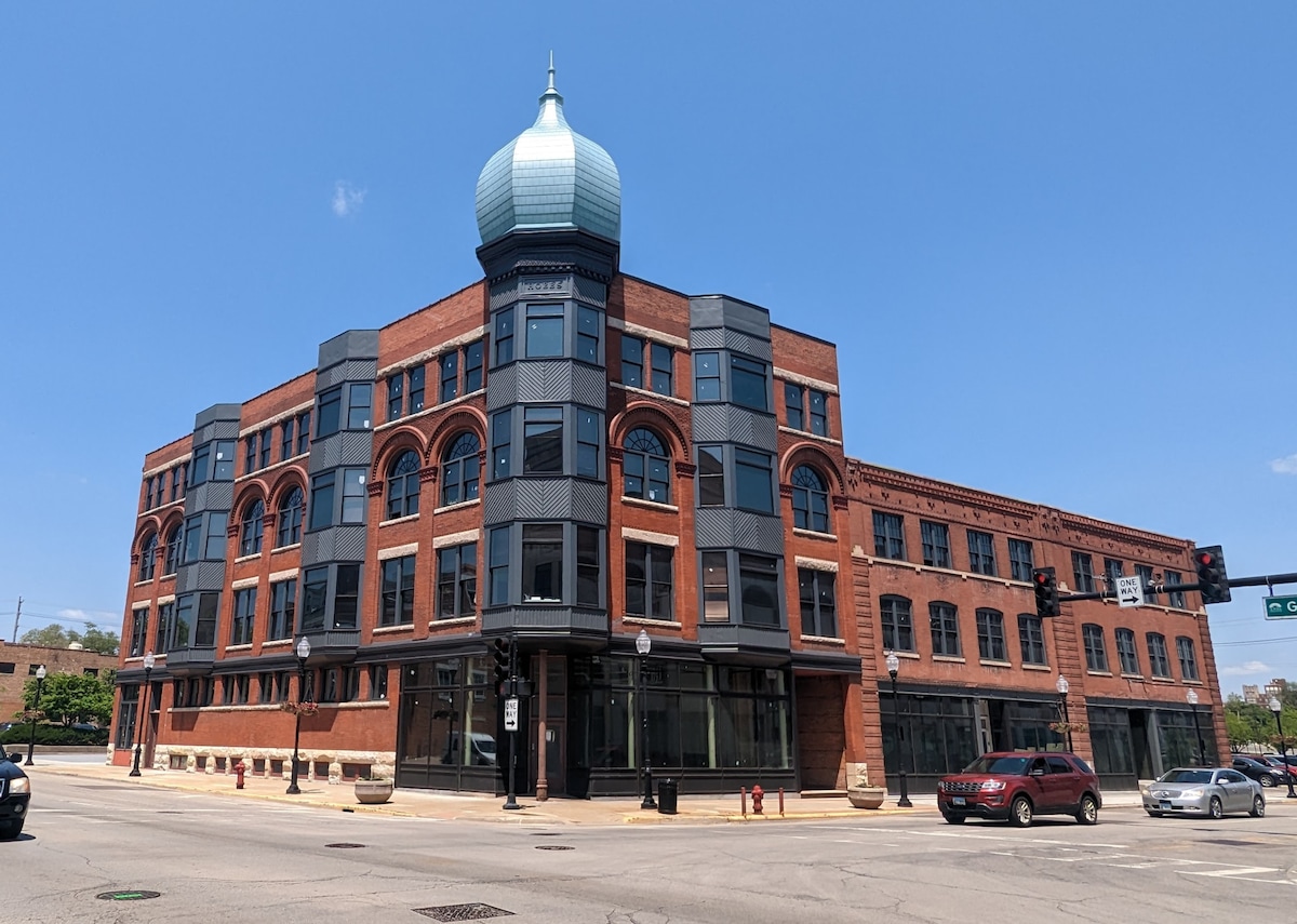 Experience luxury and historic charm at the Penthouse in the Historic Hobbs. Built in 1892, and restored in 2023, this new one bedroom corner unit offers a panoramic view of the Aurora skyline. Cook a delicious meal in the fully stocked kitchen. Dine at the bespoke table in the window bay under the iconic onion dome. Relax on the cozy sofa and enjoy a movie on the big screen TV. Rest in the plush king-sized bed. This urban retreat is near coffee, shopping, art and entertainment.
