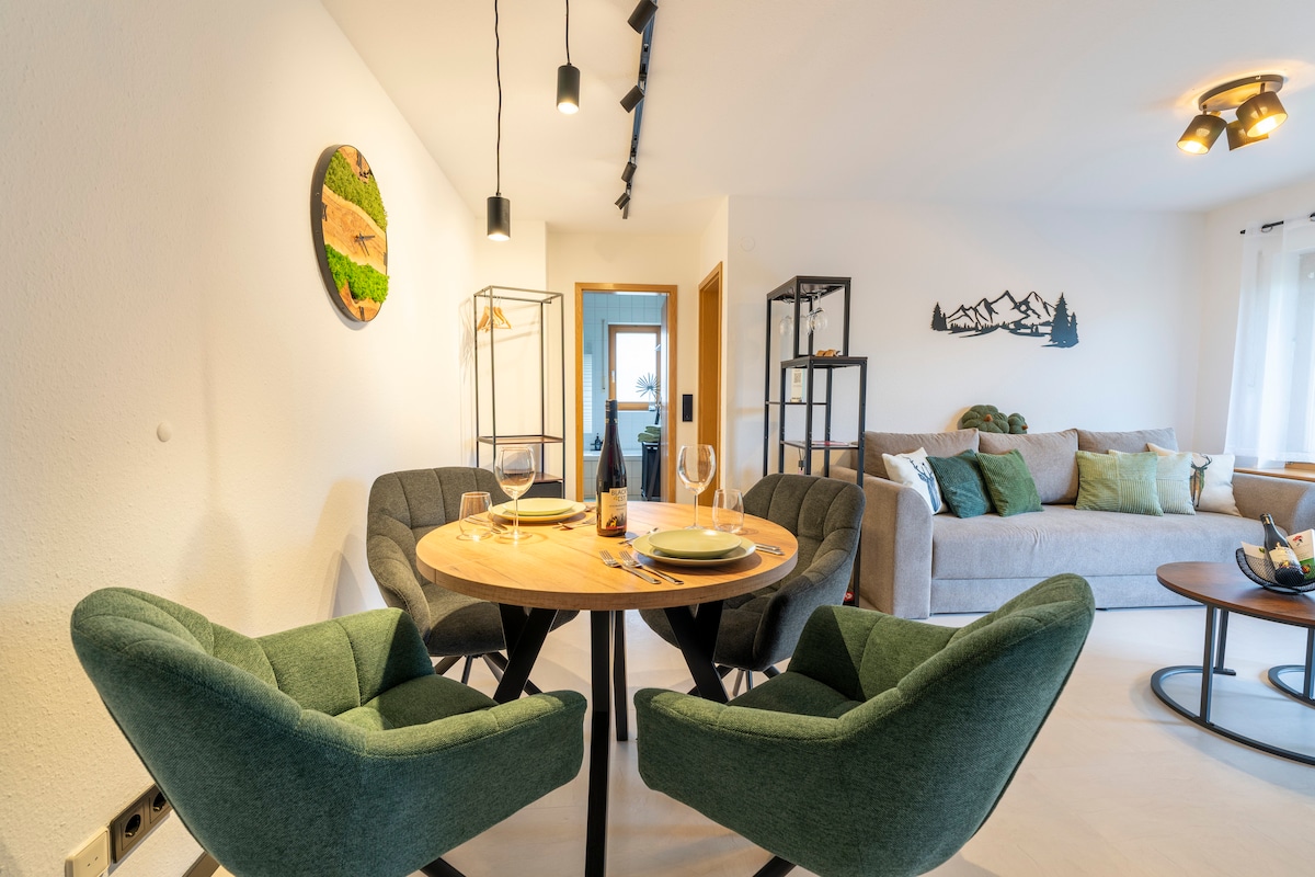 The "Das Waldo" holiday apartment is in a rural location surrounded by beautiful nature. From the property you can reach beautiful hiking and biking trails, ski trails, ski lifts and the dreamy climatic health resort of Saig. The 35 square meter apartment was designed entirely in-house and expanded with high standards of design and materials. The stylishly furnished bedroom and living room with wallpaper in the mystical Black Forest print and a view of nature is just one of the many highlights.