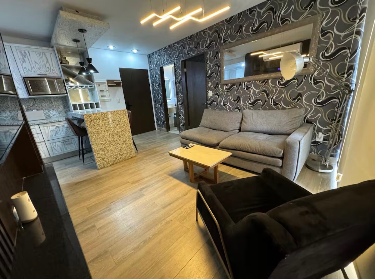 Elegante departamento de 2 recámaras en el cuarto piso con elevador, ubicado en exclusiva zona residencial. Cuenta con cocina equipada, sala y comedor amplios, estacionamiento gratuito y amenidades como alberca, gimnasio y salón de estar. A pasos de malls, bancos, restaurantes y tiendas. Con acceso rápido al aeropuerto por vía principal. Ideal para familias o viajes de negocios que buscan comodidad, ubicación y estilo.