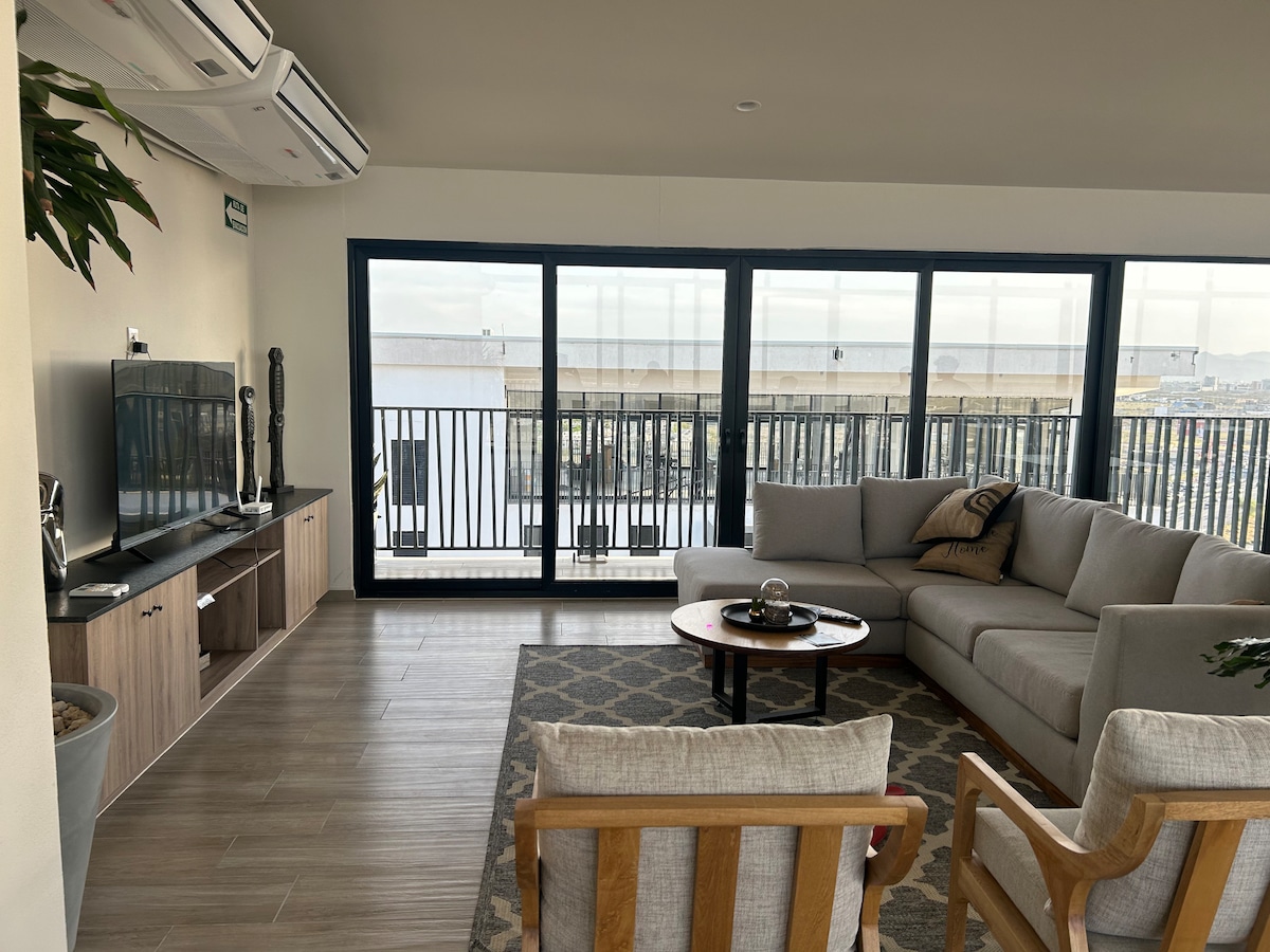 Relájate en este espacio tranquilo y elegante. Disfruta de un departamento totalmente equipado y NUEVO. Pantalla de 70” en el área social y de 55” en los cuartos. Amplios baños, clósets, lavandería, camas queen, minisplit’s en todas la áreas, cocina equipada, acceso a roof top con vista panorámica. Combinamos el buen gusto y modernidad con el comfort. Cerca de restaurantes y súper mercados. Disfruta tu estancia en nuestro departamento diseñado para satisfacer tus necesidades.
