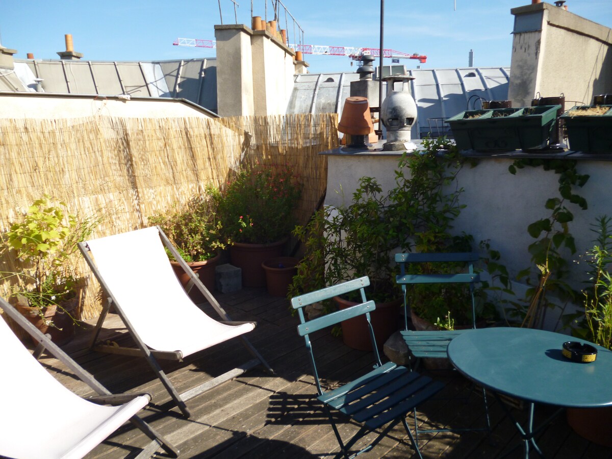 90m² Triplex apartment +35m2 terraces, center of Paris, quiet with rooftop view, 4 rooms, 1 balcony + 1 Panoramic terrace, bedroom with 1 bed 160x200, bedroom with 2 twin beds 90x190, an office with a sofa bed 140x200, 2 bathrooms with WC.
