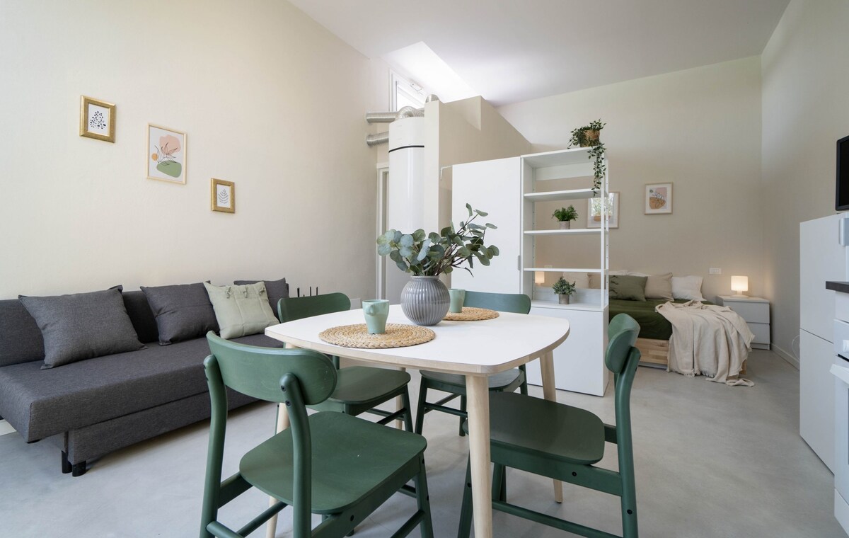 Budrionun əsas meydanında yerləşən və iki eyvana baxan yenicə təmir edilmiş studiya. Avtobus dayanacağından 100 m, qatar dayanacağından 200 metr və xəstəxanadan 350 metr məsafədədir. Döşəmə isitmə sistemi, ənənəvi soba, mikrodalğalı soba, qəhvə maşını, soyuducu və dondurucusu olan mətbəx. Paltarqurudan və paltar şkafını yuyun. Fransız çarpayısı. Ağıllı televizor və pulsuz WI-FI. Xromoterapiya ilə böyük duş. Lift olmayan ikinci mərtəbədədir.