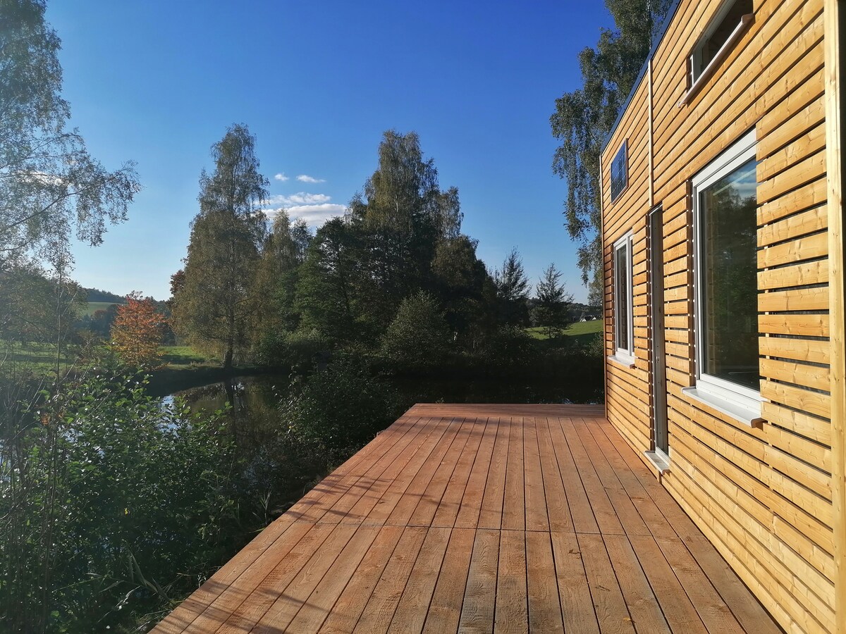bir hektar eko-otaqda romantik məkan. Ev yeni tikilib (6/24), gözəllik, rahatlıq və ekologiyaya böyük diqqət yetirilib. Ev şüşə panellərlə örtülüb və yataq otağından yaşıl sahəyə gözəl mənzərə açılır. Ev tam məxfilik şəraitində, ağac və kollarla əhatə olunmuş şəkildə, Çex İsveçrəsi Milli Parkının sərhədində, bağın ortasında, turistik məkanların yaxınlığında yerləşir. Yayda: duzlu su hovuzu, terrasda barbekü və təbiətdən, masajdan, açıq havada pedikürdən bir neçə addımlıq məsafədəsiniz payız, yaz: 1500/gecə ulduzların altında bitki mənşəli cakuzi vannası 350czk/adambaşına sağlam ev yeməyi