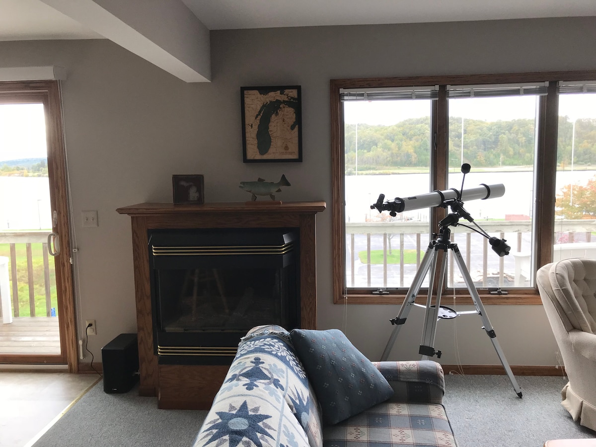 Harbor Lights Resort-da Miçiqan Gölünün qumlu Çimərliklərində Günəş Batmaları ilə Frankfortun ikonik Mayakının birbaşa möhtəşəm mənzərələrinə baxan "THE NEST" kondominiumuna xoş gəlmişsiniz. Əlbəttə ki, sizin üçün dünya səviyyəli mənzərə! Frankfurtun mərkəzindəki QUAINT-ə 2 kvartallıq qısa bir gəzinti. İki rahat, 150-179 sm ölçülü çarpayısı olan çox böyük yataq otağında sakit gecə yuxusundan zövq alın. Şimal üslublu Qonaq otağı, qazlı BUXARI var. Gözəl Miçiqan Gölünün açıq mənzərəsi olan böyük TERAS Qızdırılmış Hovuz və rahatlaşdırıcı cakuzi mövcuddur