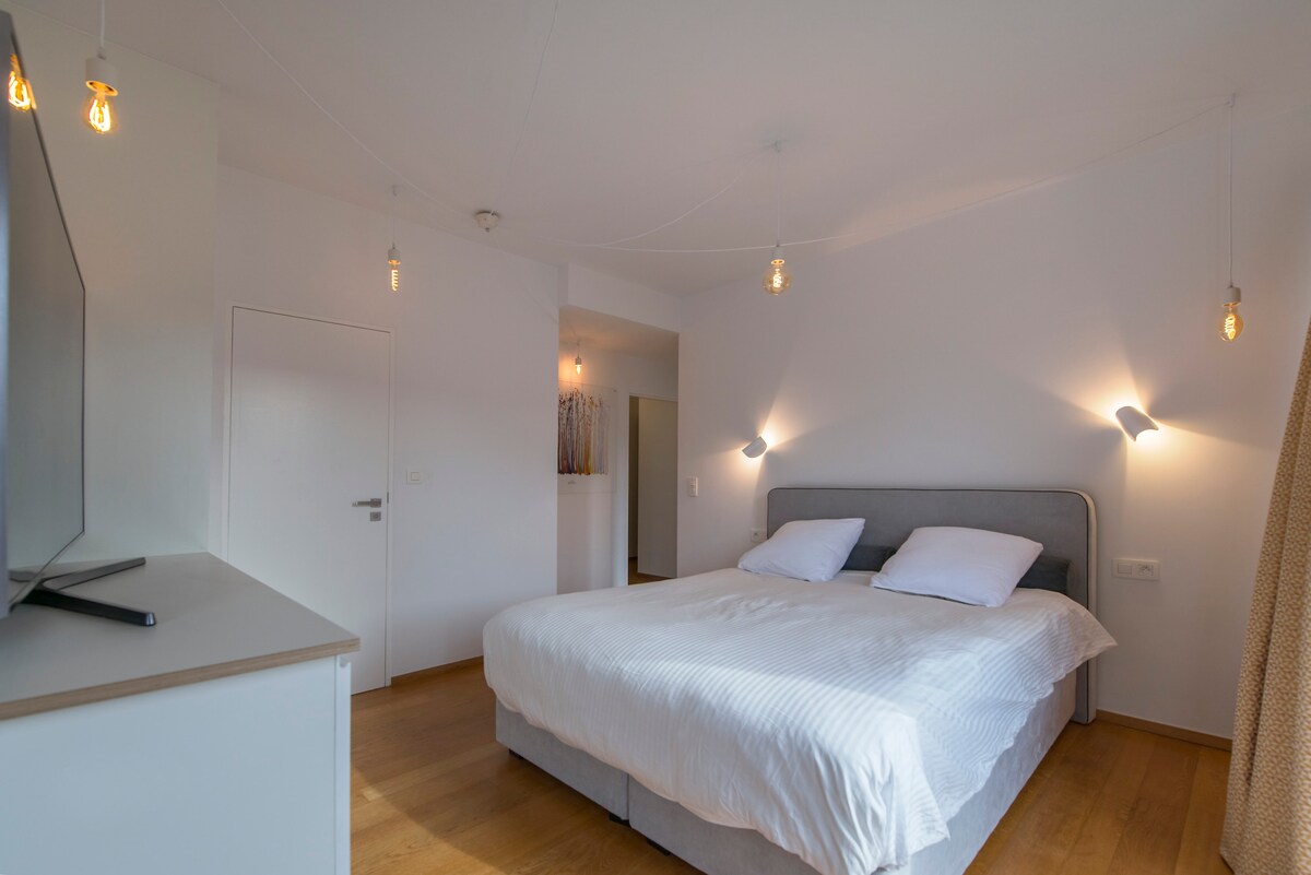 Grand appartement de 110m2 lumineux, en bord de Meuse avec PARKING fermé. Belle terrasse avec une très jolie vue. à distance de marche de la gare des Guillemins, du centre ville et du marché de La Batte le dimanche. Face au Palais des Congrès et au parc et musée de la Boverie. Idéal pour profiter de Liège entre amis ou en famille. Cuisine équipée, salle à manger et salon pourvu d'une grande télévision +NETFLIX + la wifi, 1 salle de bain et 2 chambres avec excellente literie.