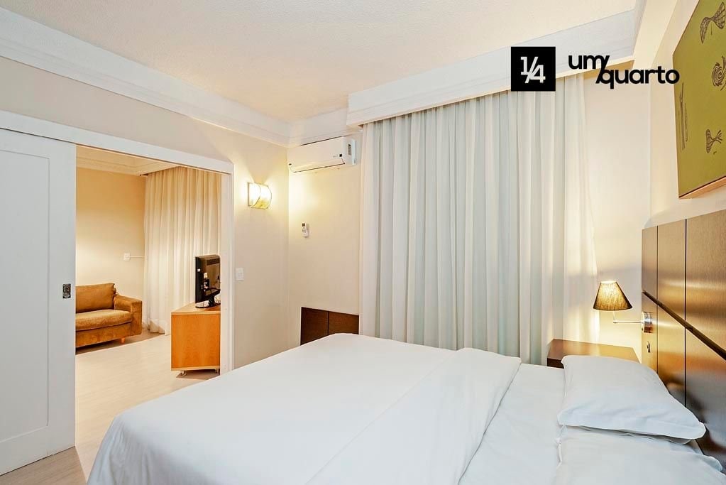 Studio on the 19th floor, located in the second tallest building in Curitiba, right in the heart of the city. One double bed plus an additional double pull-out bed, accommodating up to 4 guests. Hot and cold air conditioning, equipped kitchen with oven, microwave, stove, and coffee maker. Towels, clean bed linens, soap, and shampoo included. Heated rooftop pool with a glass ceiling where you can swim while watching planes pass overhead. Gym, squash court, and underground parking (R$50/day).
