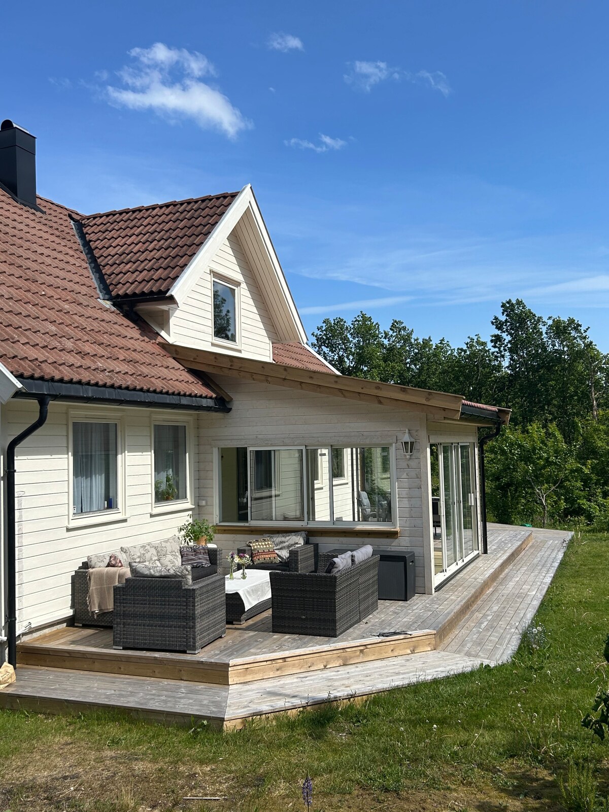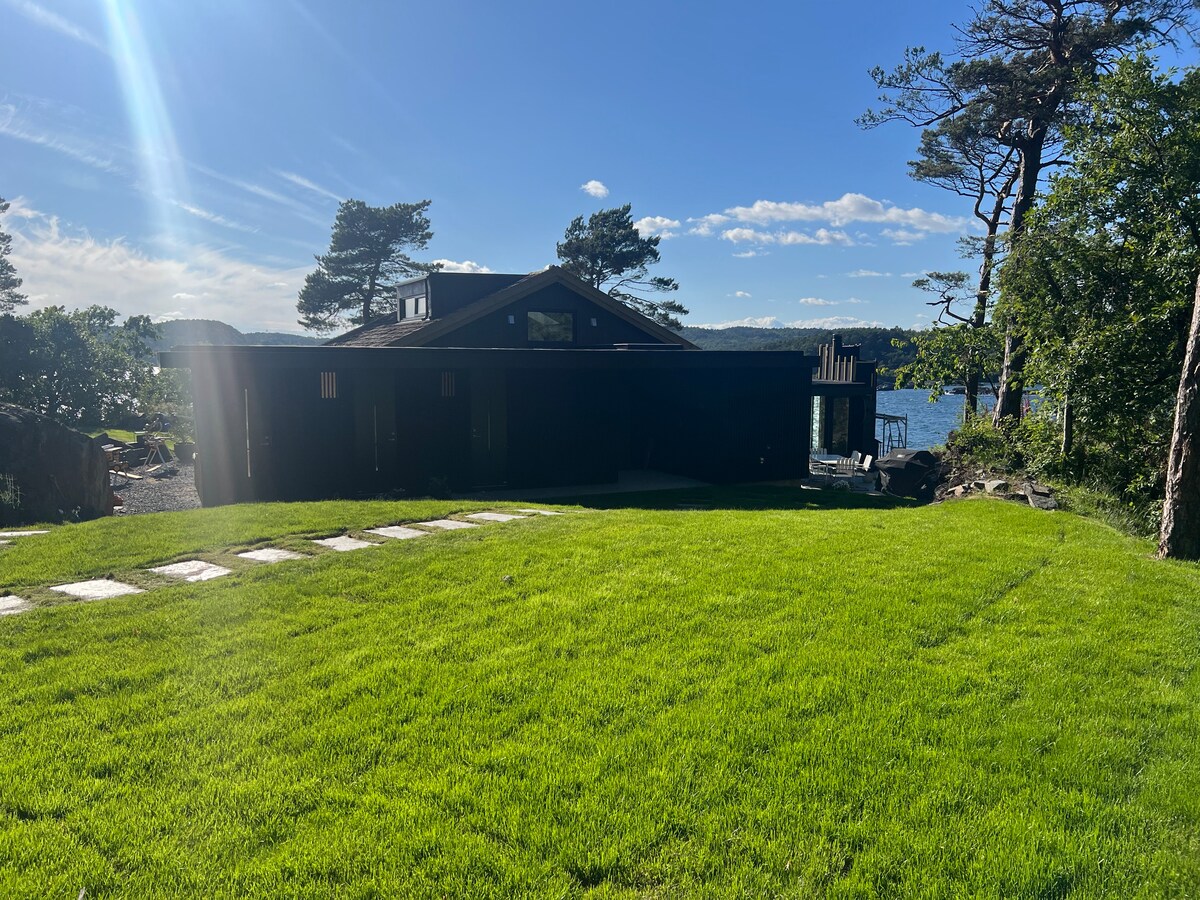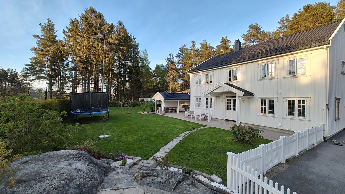 Stort helt nytt sørlandshus med stor hage sjøbu, egen strand og brygge. Passer fint for 2 familier. I oktober november tar vi med leietakere på hummerfiske. Båt. Øien 20 fot med 70 Yamaha Masse aktiviteter - fotballbane, volleyballnett, badminton, husker for store og små, slakk line, trampoline, kubbespill. 5 kajakker, 2 supbrett, 2 vannmadrasser og fiskeutstyr for fiske med brygga eller på sjøen. Fisketur med teiner, garn eller stang etter avtale. Badstue tilgjengelig for leietakere