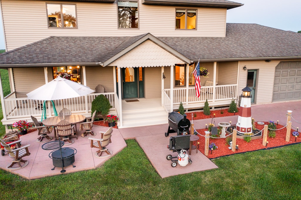 Footbridge Farm, 90 hektar meşəlik ərazidə, 15 millik Decorahda yerləşən sakit bir ölkədir. Kanoe Krikin, Yuxarı Ayova çayının ağzına və DNR torpaqlarına yaxınıq. Rahat sahibdən tikilmiş kabinə genişlik hissi verən açıq tavana və raflara malikdir. Yerli daş xarici divarlarda və odun sobasının arxasında döşəmədən tavana qədər oddan istifadə edilirdi. Döşəmələr palıd və şiferdir. Kabinədə ətraflı sənətkarlıq tapmaq olar.