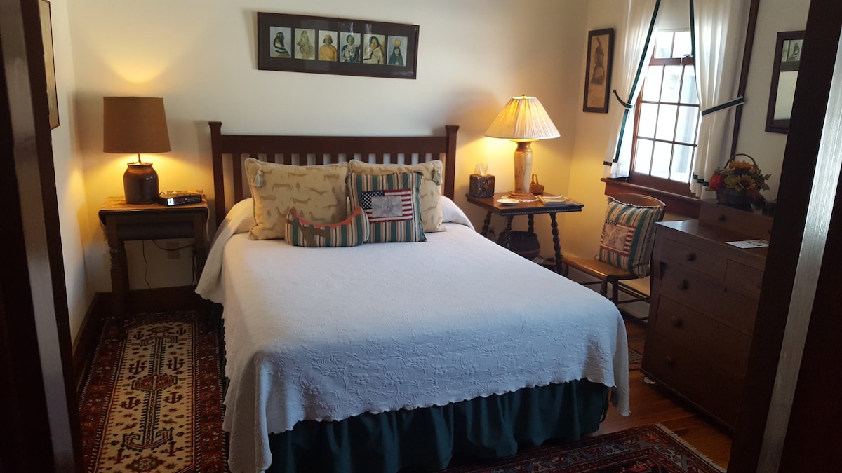 1890-cı ildə tikilmiş tamamilə təmir edilmiş ferma evi ( formal olaraq parsonaj). Gözəl mənzərəli bağlar və arxa həyətdə yerləşən oturma yerləri. Arxa həyət imkanlarına veranda, yanğın çuxuru, qamak və piknik masası daxildir. Qonaq kvartalına gedən ikinci mərtəbəyə aparan pilləkənlərə ön qapıdan (sahib tərəfindən paylaşılan) giriş edin. Bura Master BR, mini soyuducu və böyük tam vanna ilə qonaq otağı/quru mətbəx daxildir. 2-ci yataq otağı bir gecə üçün qonaq üçün 30.00 dollar əlavə xərc tələb edir.