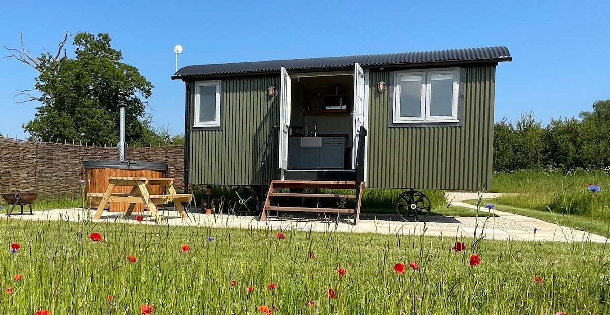 Harcomb Farm Shepherds Huts offer three huts which sleep two adult guests with an open-plan living area and shower room. In a tranquil field in this Area of Outstanding Natural Beauty, these beautifully presented boltholes have a double bed & kitchen, shower room and a private outside patio area, which looks across the idyllic Cotswold countryside and beyond. It is a truly stunning hideaway offering peace and relaxation and each have a wood fired hot tub and fire pit.