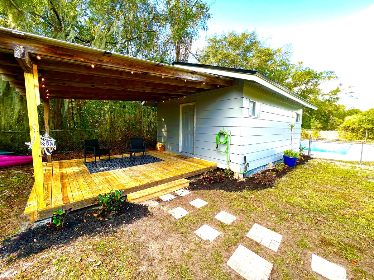 Our treehouse is located on 1 of the many islands located within the Timucuan Ecological Preserve and has been branded as the North Florida Keys(it is accessible by car). The Hideaway was just recently remodeled with modern taste and simple design to ensure that our guests feel comfortable in every aspect of their stay. The space has 1 bedroom, kitchen, bathroom and living room. The house also sits on a large lot so our guests can bring their boats or pwc’s to enjoy the local waters.