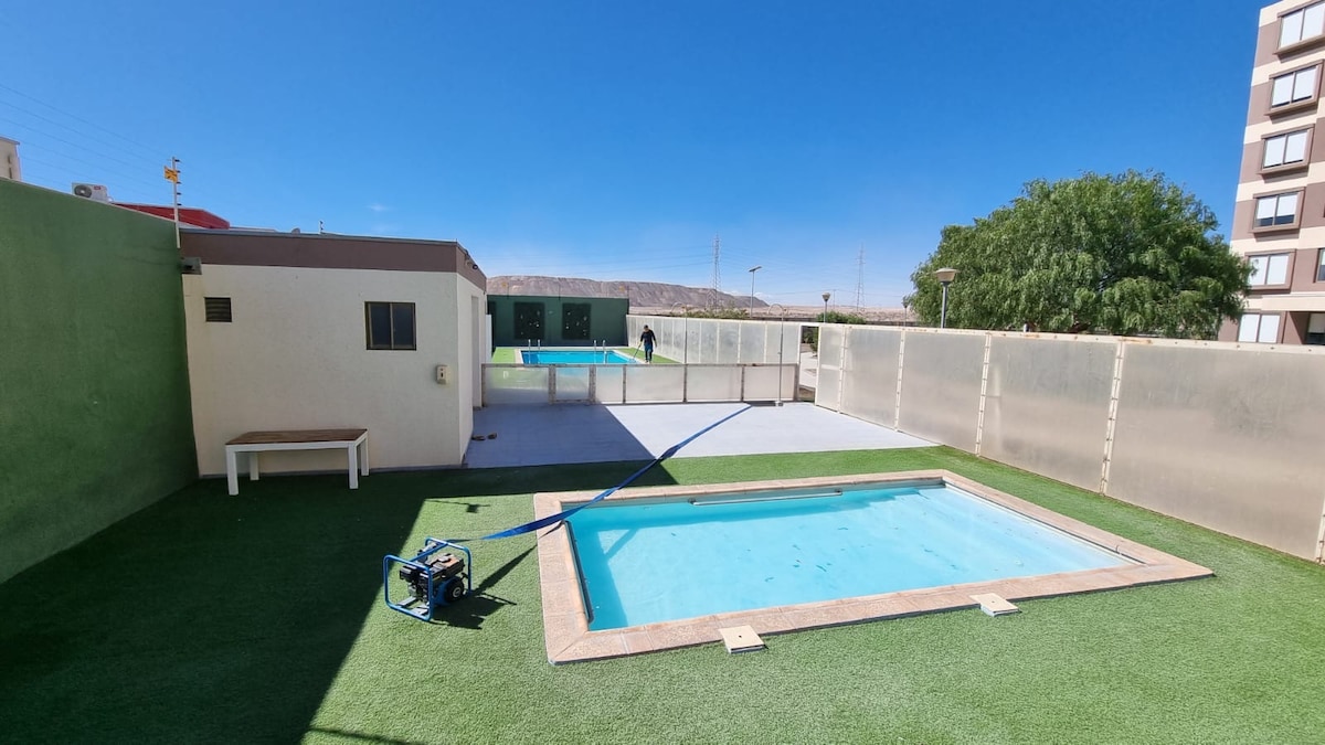 Se da factura a empresas(precio publicado más iva). Sector norte de Calama a 8 minutos del mall. Piscinas, áreas verdes, quincho, Wifi, TV, cocina equipada, lavadora secadora, estacionamiento, conserjería 24-7. 3 habitaciones: Pieza n°1: cama matrimonial Rosen. Pieza n°2: cama nido Rosen de plaza y media más colchón inferior de 1 plaza. Pieza n°3: amplio subterráneo con dos camas de plaza y media más colchón inflable de 2 plazas de buena calidad. Total personas = 8 Total camas = 6
