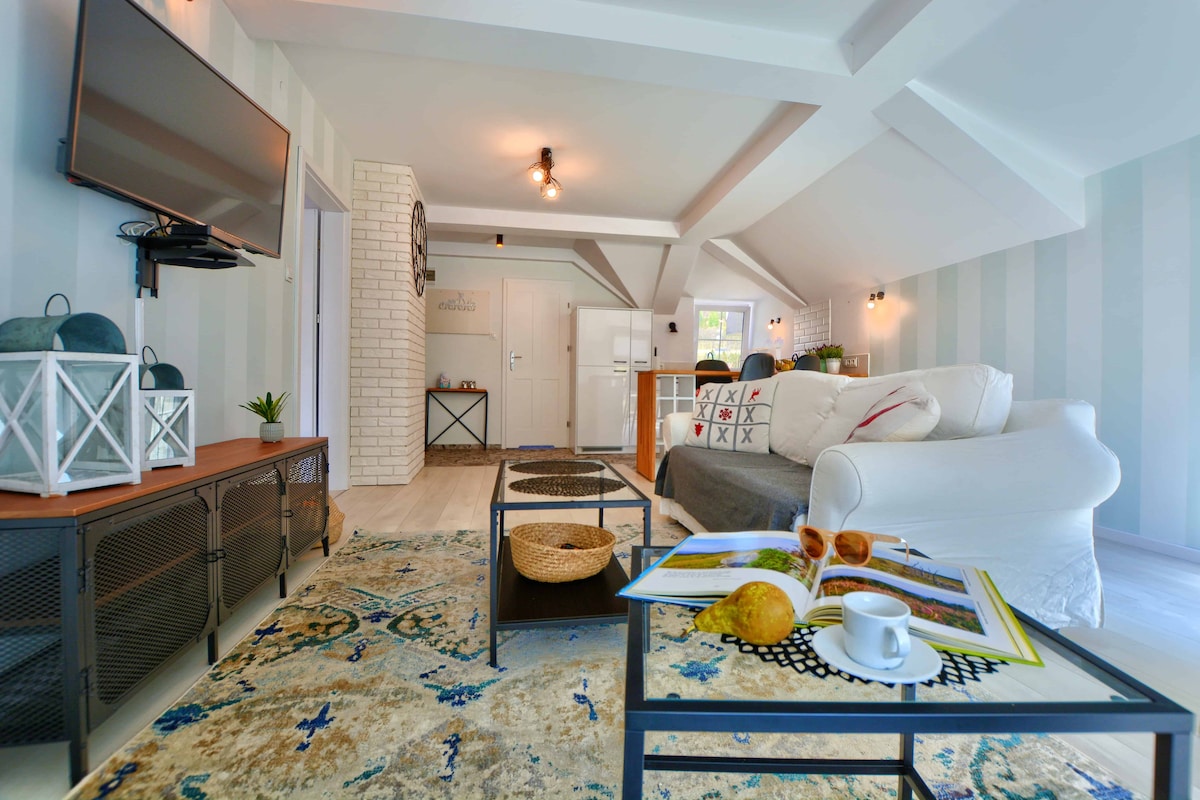 Yerli üslubu müasirlik və kənd xarakteri ilə birləşdirən iki taxta ev. Bütün il boyu açıqdır, hər biri iki müstəqil mənzilə (48 m² + 15 m² terras) bölünür, ayrıca girişi, balaca mətbəxi, qonaq otağı, iki yataq otağı və hamam otağı var. Bütün yataq otaqlarında fıstıq meşəsinin gözəl ətrafına və ya Połoninin uzaq panoramasına baxan balkon var. Ən kiçik qonaqlarımız üçün tramplinləri olan iki oyun meydançası var.
