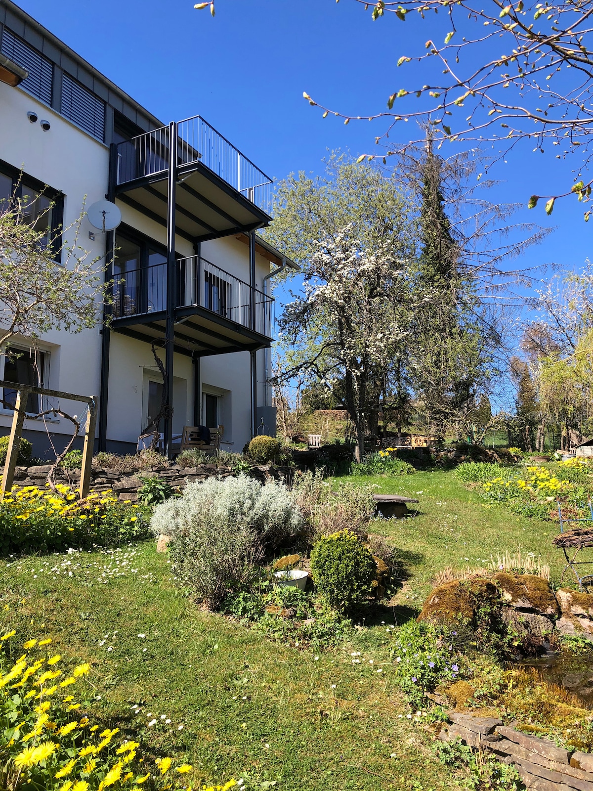 Hier wohnst du in einer sonnendurchfluteten Ruheoase mit Ausblick auf das schöne Weiltal. Ob Wellnesstrip, sicherer Aufenthalt mit Kleinkind/Baby, Urlaub mit Hund oder einfach der Wunsch nach einem idyllischen Ruheort in der Natur. Zum Wandern, Radfahren, Chillen, Golfen, sonnen. Traumhafter Schlaf in nachhaltig produzierter Wäsche. Das Anwesen, Pool, Whirlpool, Sauna gehört nicht exklusiv dazu, wird noch mit 2 Gästen und uns geteilt! Es gibt 2 Fewos auf dem Grundstück.