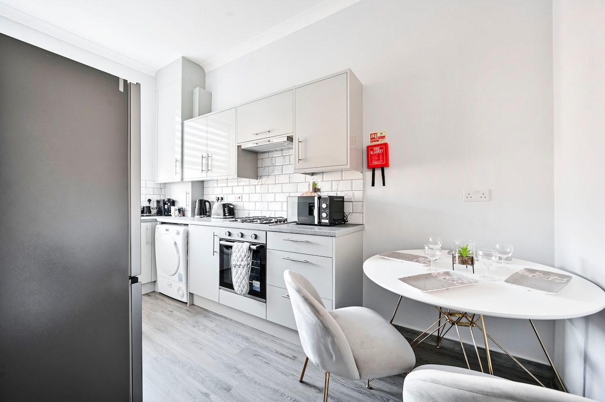 Qəşəng şəhər gəzintinizə xoş gəlmisiniz! Çarpayıya çevrilən iki divanlı bu müasir bir yataq otağı kiçik qruplar və ya ailələr üçün idealdır. Qəhvə maşını, paltaryuyan və quruducunun olduğu, əngəlsiz qonaqlama üçün ehtiyacınız olan hər şeyin olduğu tam təchiz olunmuş mətbəxdən zövq alın. Təzə döşəkağılar, pulsuz tualet ləvazimatları və sərinləşdirici içkilərlə təchiz edilmiş soyuducusu olan işıqlı, rahat bir məkanda dincəlin. Londonun mərkəzində komfort və rahatlığın mükəmməl qarışığı. Sizə ev sahibliyi etməyi səbirsizliklə gözləyirik.