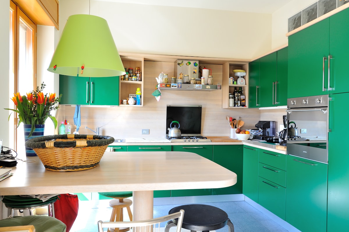 Parlaq Ev; mərkəzi mövqedə sakit məkan: paltaryuyan maşın, kondisioner, qəhvə maşını olan mətbəx və bütün faydalı cihazlar, pulsuz Wi-Fi, iş sahəsi və ictimai nəqliyyat kimi imkanlardan istifadə edərək şəhərin hər yerinə asanlıqla çatmaq üçün 2 dəq məsafədə. Bütün ehtiyaclar üçün ərazidəki mağazalar, restoranlar, apteklər və supermarketlər. mənzil binanın üst mərtəbəsində təbii işığın olması ilə xarakterizə olunur. CIN KODU: IT015146C2LERJCAL7