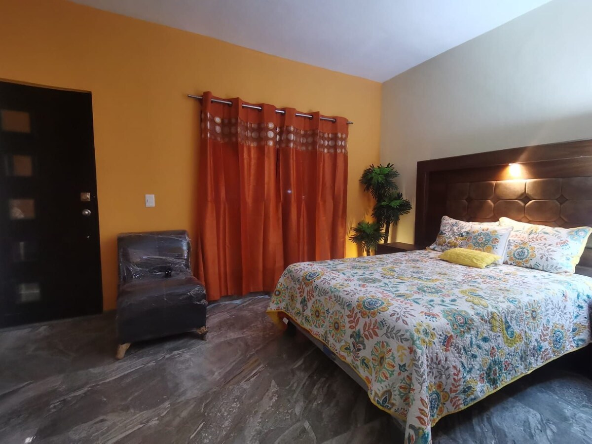 Relájate con toda la familia en este alojamiento donde la tranquilidad se respira.! Cuenta con agua caliente, internet, 1 Pantalla, Netflix activo, ventilador, refri, licuadora, estufa, trastes y sartenes necesarios etc. cuenta con una cama king size, 1 sofá cama, y un colchón individual extra.! Casa Ideal para incluso 6 personas, cuenta con cochera para dos carros, Dónde podrías utilizarla para un convivió familiar ya que cuenta con un asador y 1 tablón plegable y sillas para 10 personas