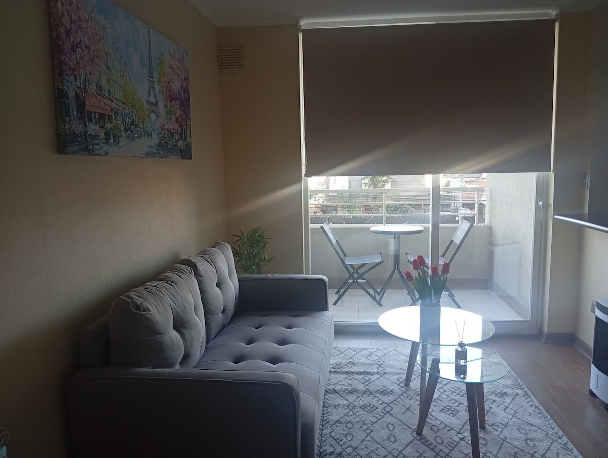 Disfruta de hermoso departamento con 3 habitaciones, tranquilo y céntrico, ubicado en barrio residencial, con vistas hacia la cordillera de Los Andes y centro de la ciudad. Cercano a terminales de buses, supermercados y strip center. Locomoción colectiva cercana. Conserjeria las 24 horas del día y cuenta con estacionamiento propio, además tiene cerradura inteligente.